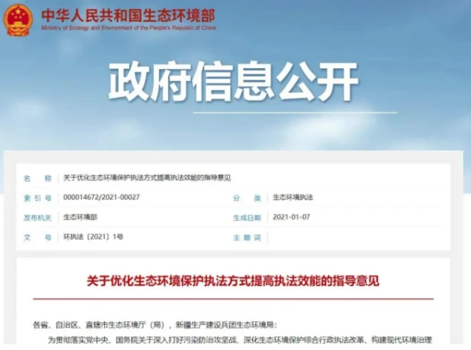 2021年1月,生態(tài)環(huán)境部印發(fā)《關(guān)于優(yōu)化生態(tài)環(huán)境保護(hù)執(zhí)法方式提高執(zhí)法效能的指導(dǎo)意見》,將其作為引導(dǎo)生態(tài)環(huán)境執(zhí)法工作、推動(dòng)執(zhí)法制度機(jī)制創(chuàng)新的重要指南,指導(dǎo)各地進(jìn)一步明確執(zhí)法責(zé)任、優(yōu)化執(zhí)法方式、完善執(zhí)法機(jī)制、規(guī)范執(zhí)法工作,切實(shí)提高執(zhí)法效能。