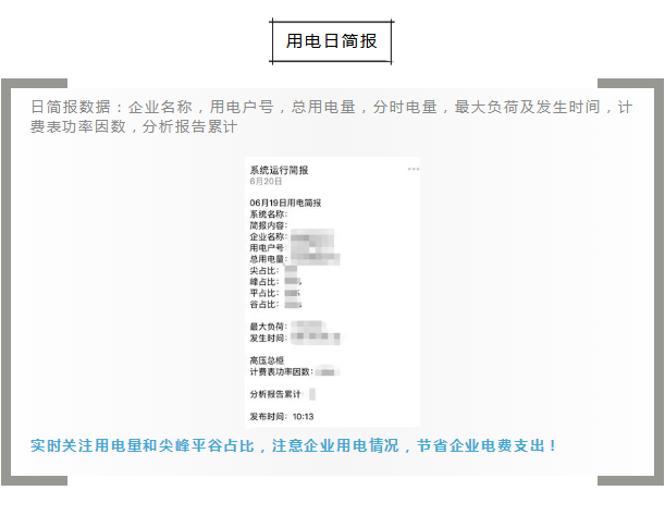 默認(rèn)推送的數(shù)據(jù)項(xiàng):企業(yè)名稱、用電戶號(hào)、分析報(bào)告累計(jì)、最大負(fù)荷及發(fā)生時(shí)間、最大需量及發(fā)生時(shí)間(月報(bào))、計(jì)費(fèi)表功率因數(shù)、總用電量、分時(shí)電量