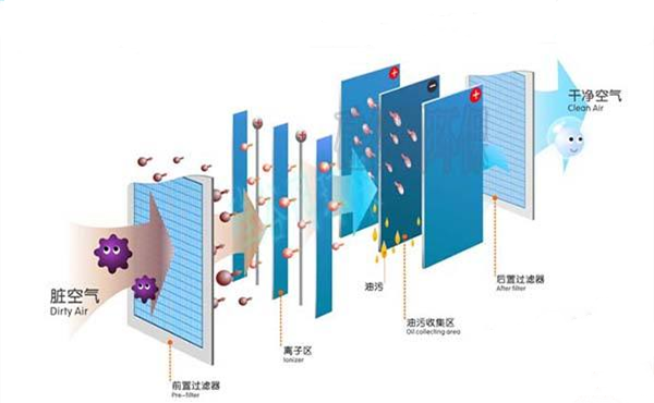 該油煙凈化器為二級式靜電吸附型,用來(lái)去除細微粒徑的碳氧化合物盒其他空氣中的雜粒。二級式是指靜電模塊分為電離區和集塵區,電離區由多根鎢鋼絲或尖刺極板組成,安裝在接地板中間,并通入高壓直流電。大氣中的微粒在通過(guò)電離區的強力靜電場(chǎng)時(shí),被電離并帶有正或負電荷。集塵區則由大量平行板組成,通入低壓直流電(極性同電離區一致,但電壓減半)以形成電場(chǎng),帶電微粒被帶點(diǎn)極板排斥同時(shí)被接地極板吸引。如此,空氣中的雜質(zhì)顆粒會(huì )被有效去除。